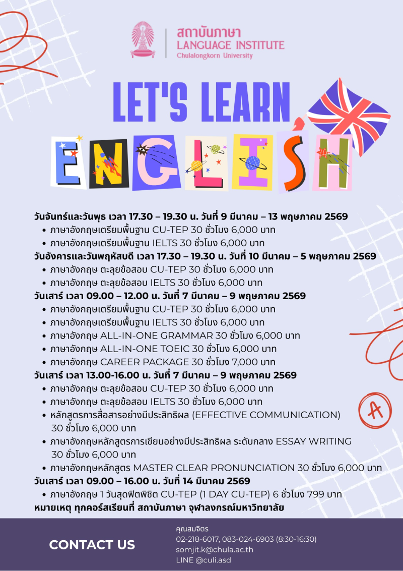 เรียนวันเสาร์ที่ 14 มีนาคม 2569 ที่สถาบันภาษา จุฬาลงกรณ์มหาวิทยาลัย