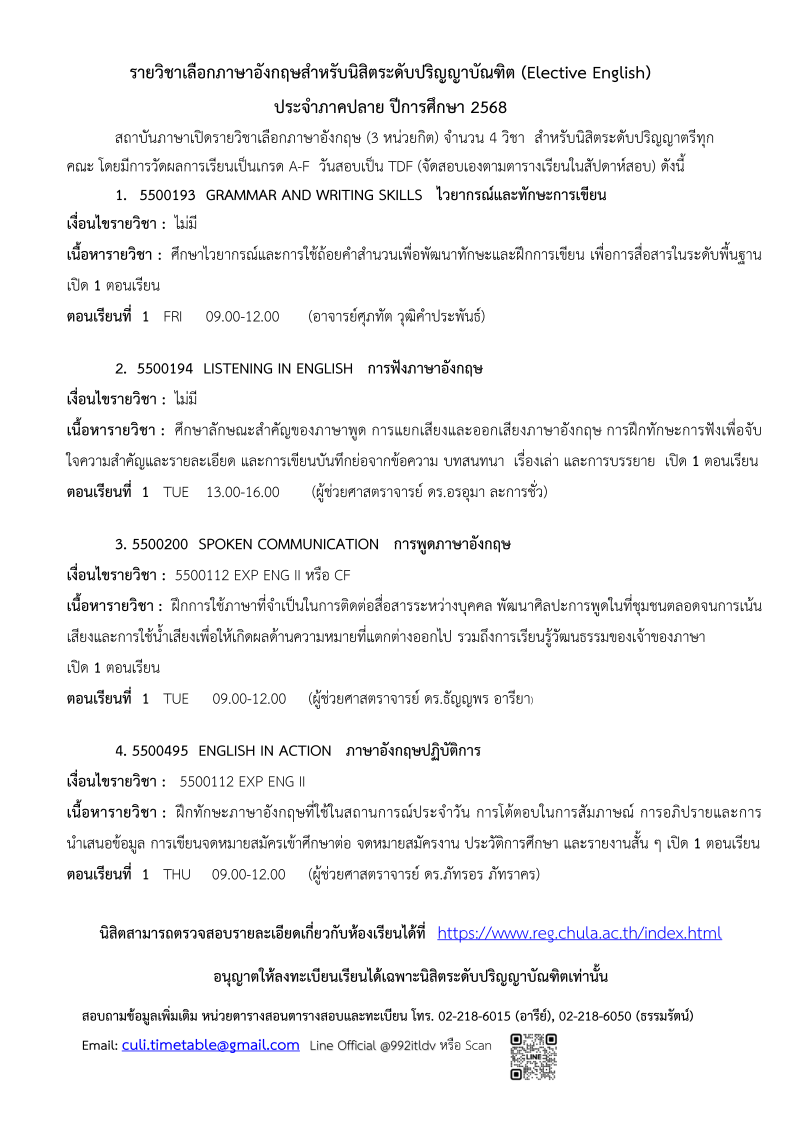 รายละเอียดภาษาอังกฤษวิชาเลือกสำหรับนิสิตระดับปริญญาบัณฑิต (Elective English) ประจำภาคปลาย ปีการศึกษา 2568